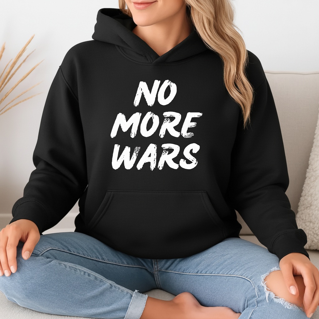 By avoiding cluttered graphics or unnecessary illustrations, the design ensures that the critical anti-war statement remains the absolute focal point. The stark contrast between the heavy font and the background fabric is specifically engineered to maximize legibility, allowing the opposition to new conflicts to be read clearly from a distance during political rallies and activism events. The design’s aesthetic is raw, uncompromising, and fundamentally text-driven, functioning as a clear, wearable placard for progressive and politically engaged individuals.